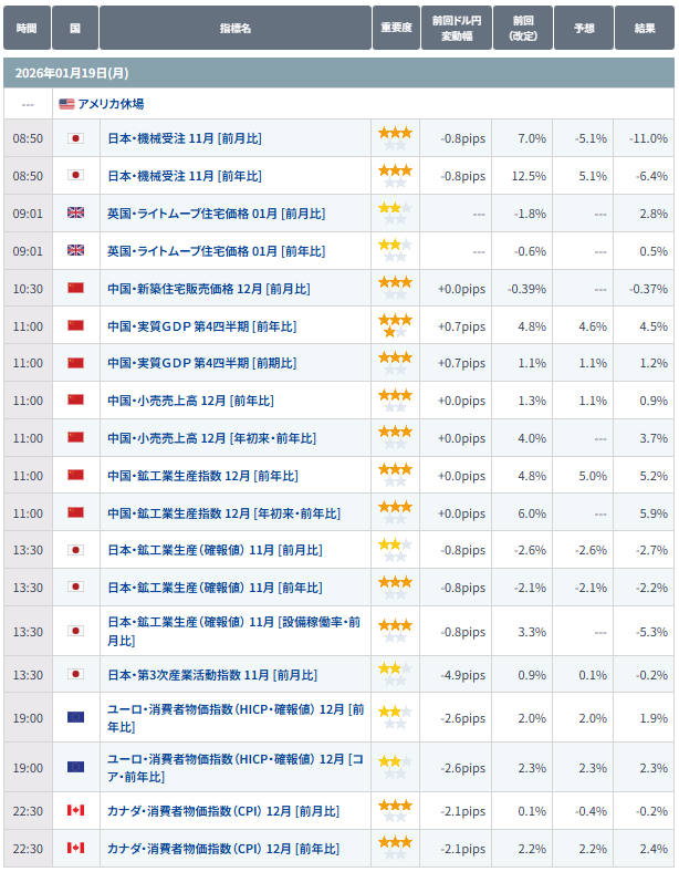 直近の市場では取引参加者が日米の政策・政治要因を中心に動意づいており、流動性は普段通りだがアメリカ市場が祝日(Martin Luther King Jr. Day)で薄商いとなる可能性がある状況です。主要イベントは重ならないため、テクニカル反応が出やすい局面です。